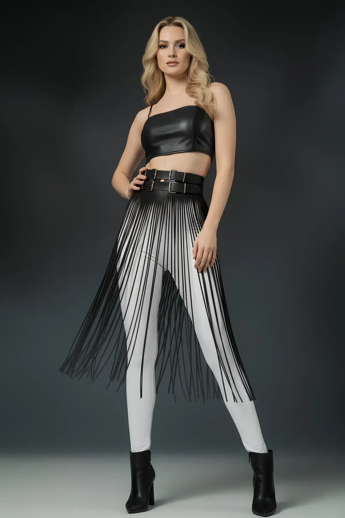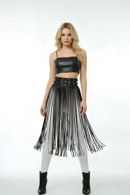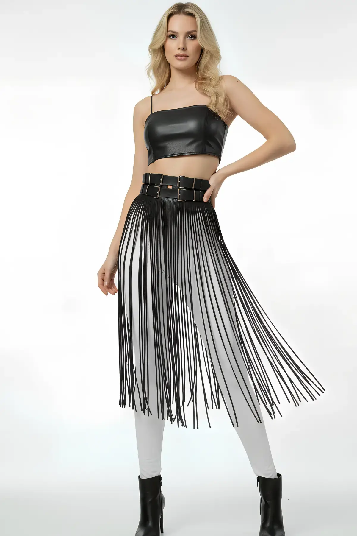 Siyah Etek Deri Yüksek Bel Etek Çift Tokalı Uzun – APFT1090